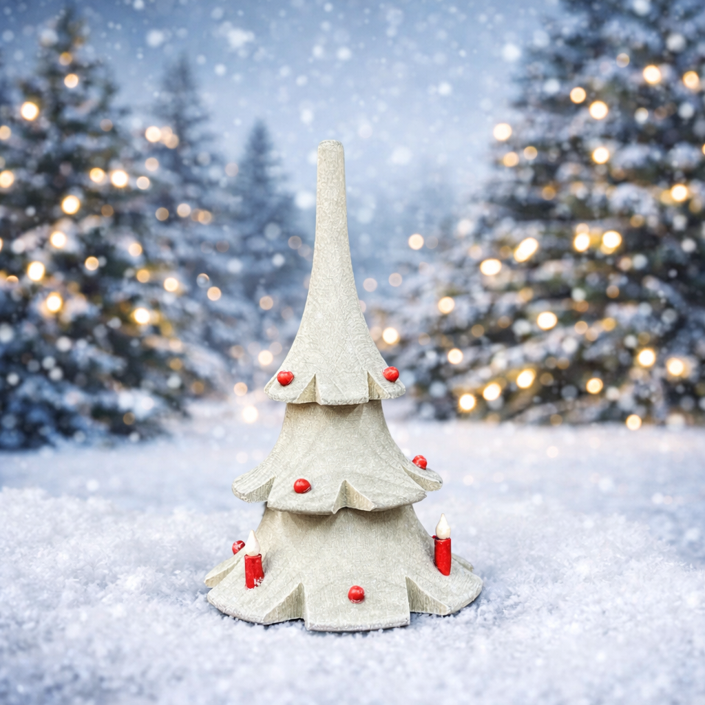 A sweet wooden Christmas tree figurine handcrafted in Germany, decorated with tiny red candle accents. Its simple, elegant shape brings a warm, traditional holiday touch to your festive décor — perfect for small displays, shelves, or mini village scenes.